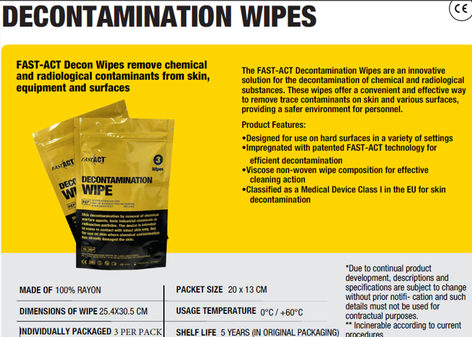 The FAST-ACT Decontamination Wipes are an essential tool for safety in environments exposed to hazardous materials. These advanced wipes are specifically designed for the efficient removal of radiological particles and the neutralization of harmful chemicals. Ideal for both emergency response and everyday protection, they ensure a cleaner, safer environment by effectively cleansing trace contaminants from skin and a multitude of surfaces. Compact and easy to use, these wipes provide peace of mind and reliable protection in potentially dangerous situations.
