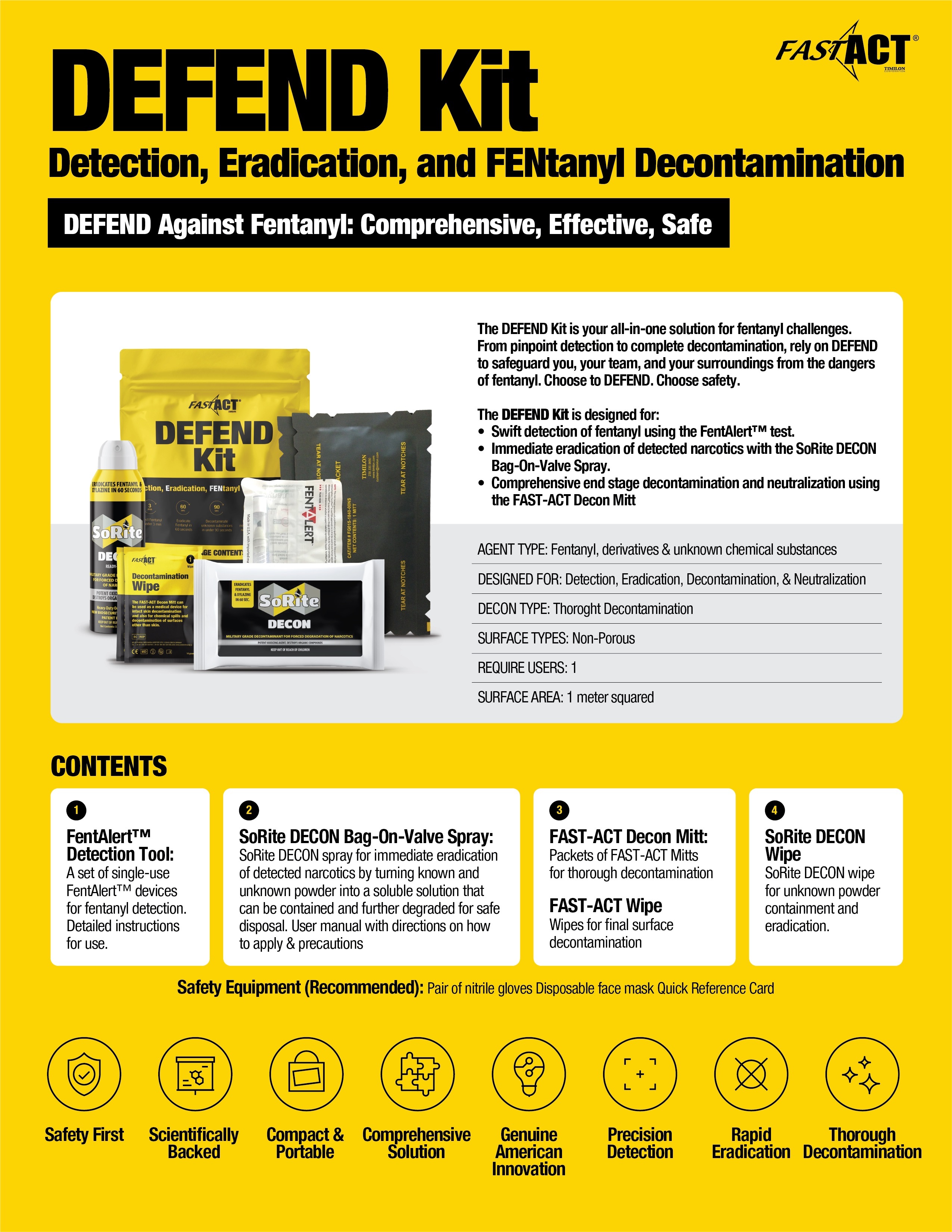 The DEFEND Kit is a comprehensive Fentanyl Decontamination Kit designed to address the critical challenges posed by fentanyl exposure. This all-in-one solution provides everything you need for pinpoint detection and thorough decontamination, ensuring the safety of you, your team, and your environment. Whether you're in law enforcement, emergency response, or any field requiring reliable protection against fentanyl, trust the DEFEND Kit to offer unparalleled safety and peace of mind. Choose to DEFEND. Choose safety.