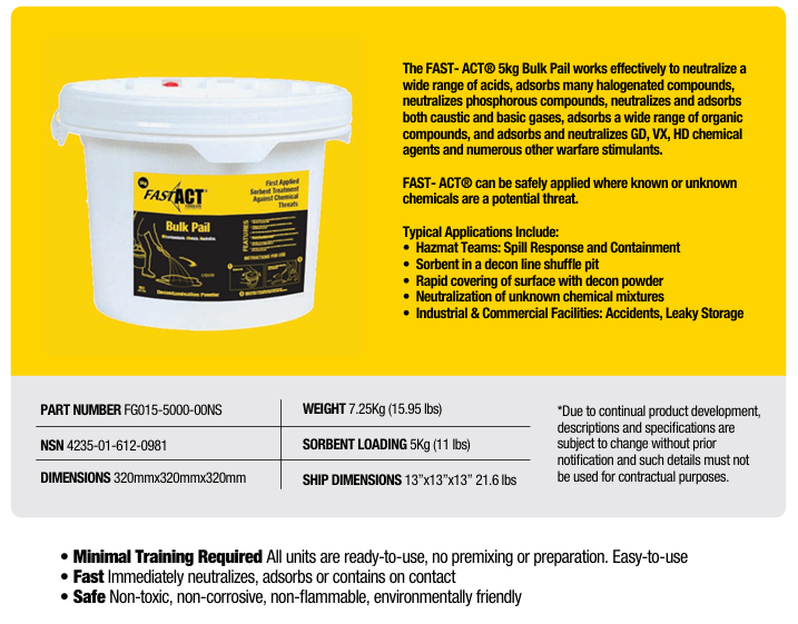 The FAST-ACT® Bulk Pail is a comprehensive solution for managing hazardous chemical spills and decontamination. Designed for maximum efficiency, the 5kg Bulk Dry Decontamination Pail effectively neutralizes a broad spectrum of harmful substances, making it an essential tool for safety and emergency response teams. This versatile pail excels at neutralizing a wide range of acids and is highly effective against phosphorous compounds. It adeptly adsorbs halogenated compounds, organic substances, caustic and basic gases. Importantly, it neutralizes and adsorbs hazardous chemical agents such as GD, VX, HD, and various other warfare stimulants, ensuring a robust response to critical situations.